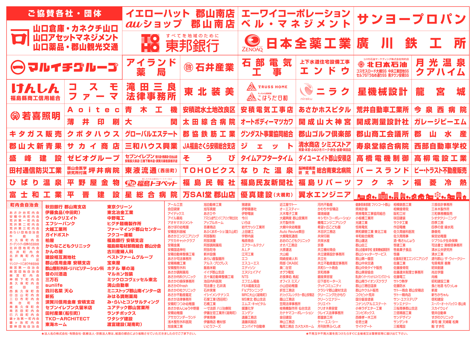 2022年8月1日 / 最終更新日時 : 2022年8月1日 安積町商工会 商工会からのお知らせ 第51回 あさか野夏まつり花火大会 協賛御礼 第51回 あさか野夏まつり花火大会開催にあたり 沢山のご協賛を賜り厚く御礼申しあげます。 8月14日(日)は、無観客により開催いたします。 観覧席、駐車場のご用意は一切ございません。 ご自宅から、あさか野夜空を眺めていただきますよう、切に願います。